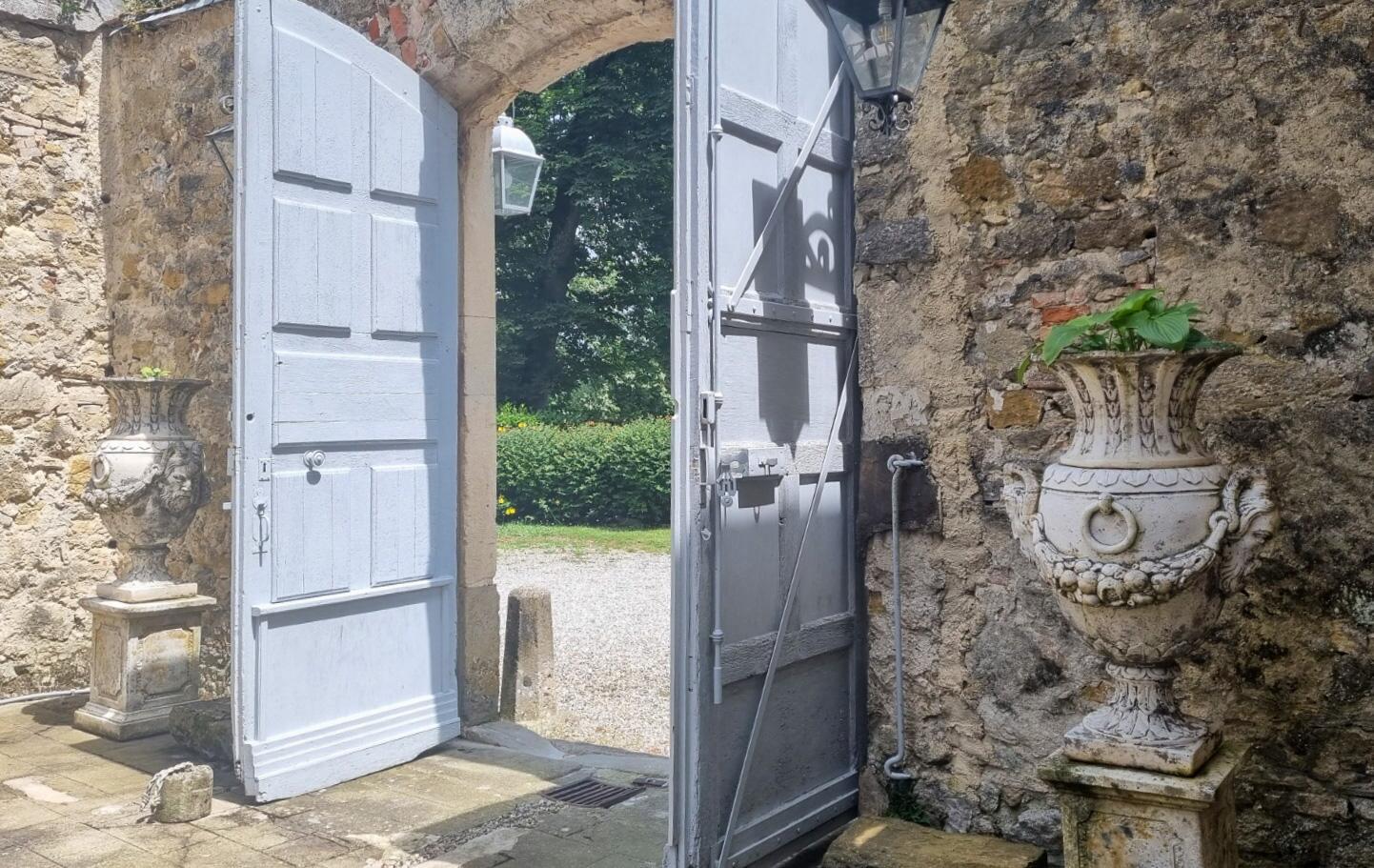 De retour dans la cour, nous trouvons les anciennes écuries qui offrent plus de possibilités pour créer un espace habitable. De grandes portes doubles en bois donnent un accès direct à la cour.