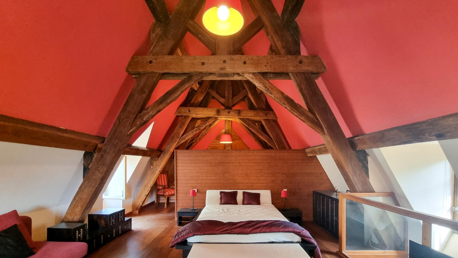 Au deuxième étage se trouve une immense suite parentale avec des plafonds voûtés et des poutres apparentes ainsi quune salle de bains attenante avec douche et double vasque.