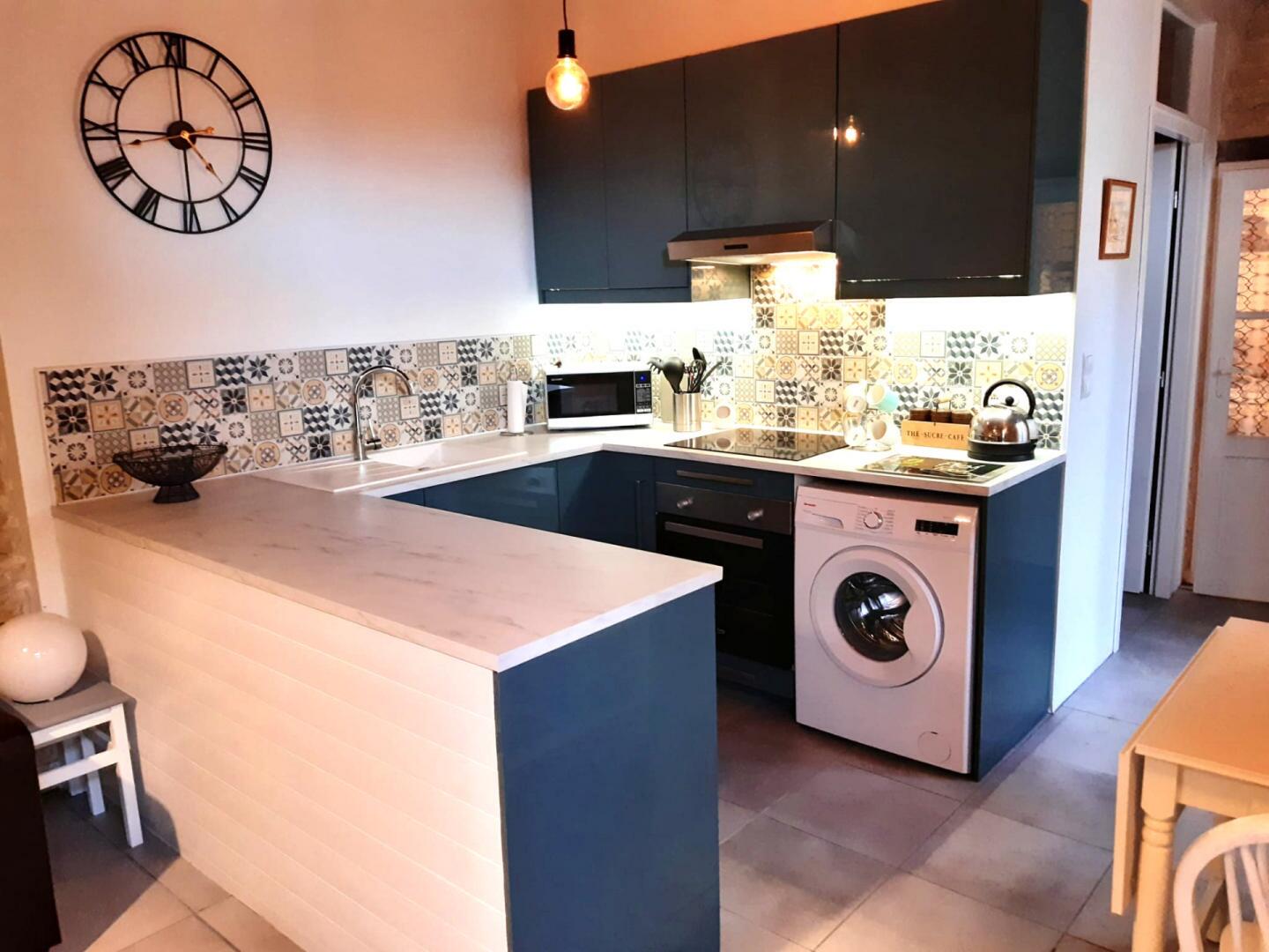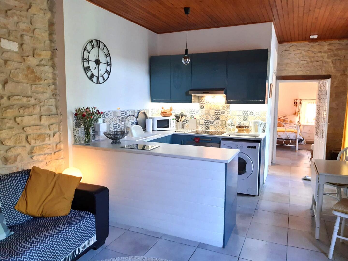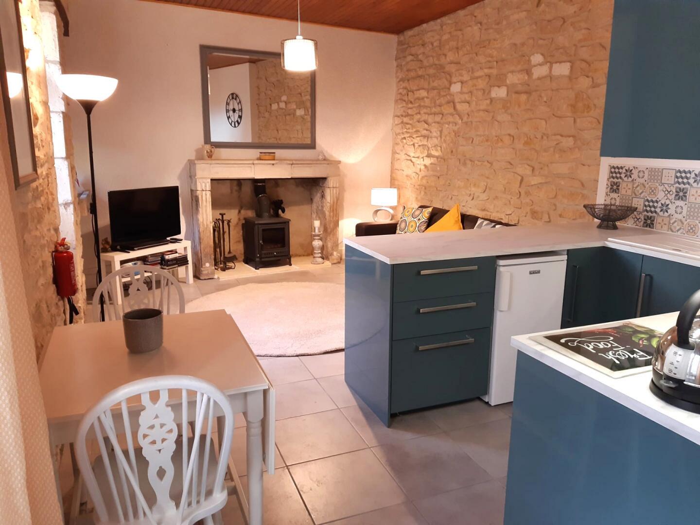 – Cuisine/salon/salle à manger (21 m²) – mur en pierre apparente et poêle à bois