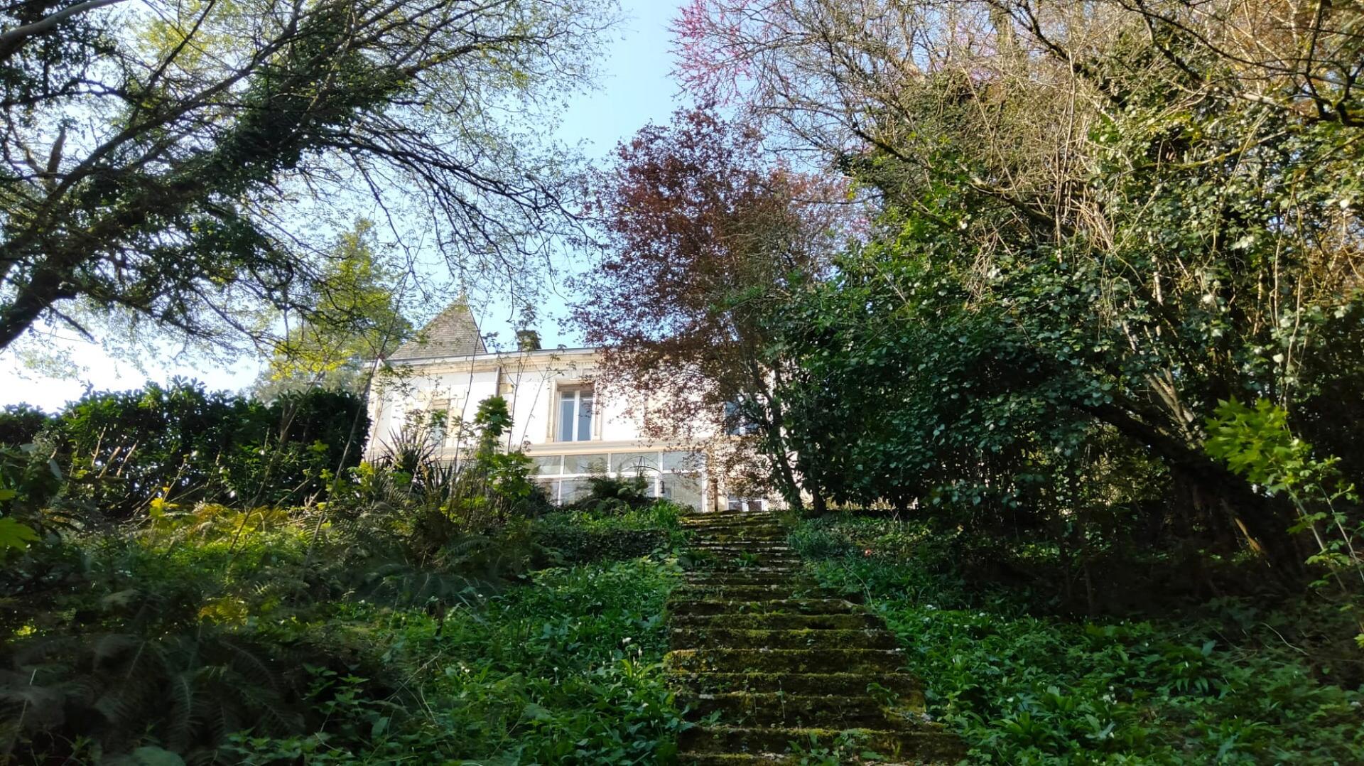Jardins classiques avec arbres matures, partie boisée, piscine privée de 12 x 5 m avec couverture, grande terrasse et espaces ombragés propices à la détente. À l’arrière, un terrain boisé avec des marches menant à la rivière Charente.