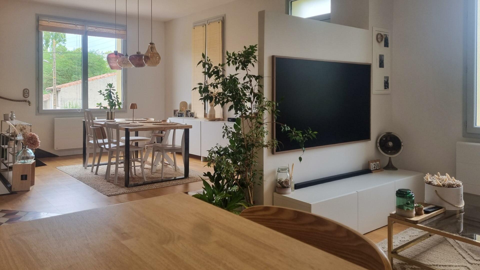 Salon et salle à manger ouverts avec vue sur le jardin