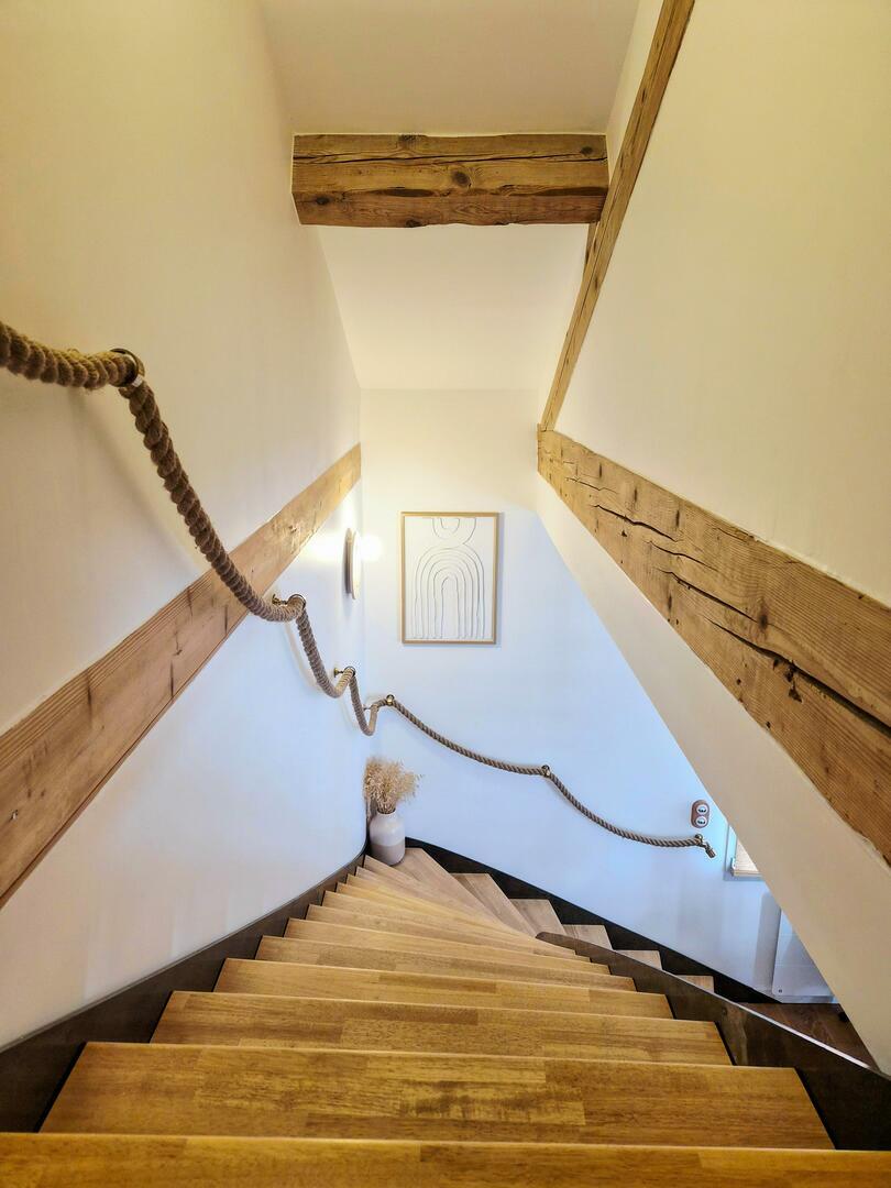 Sols en chêne massif, carreaux de ciment, terrazzo et poutres apparentes